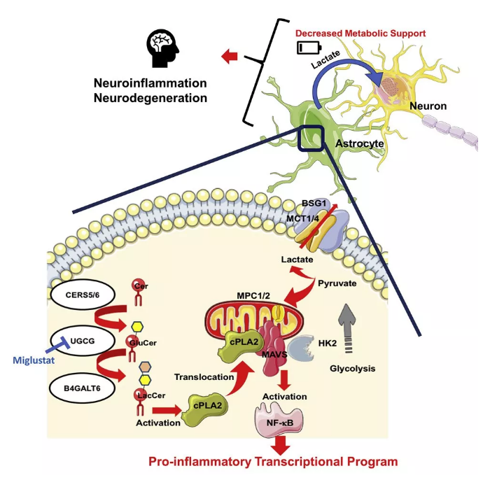 研究团队发现,星形胶质细胞中的 cPLA2 的 C2 结构域与 MAVS 中的 CARD 结构域相互作用,在实验性自身免疫性脑脊髓炎 (EAE) 以及潜在的多发性硬化症 (MS) 中上调 NF-κB 驱使的转录,促进中枢神经系统 (CNS) 的炎症发生;cPLA2 被招募到 MAVS,破坏了 MAVS- 己糖激酶 2 (HK2) 间的相互作用,降低了 HK 的酶活以及参与神经元代谢的乳酸水平;Miglustat (一种于治疗 Gaucher 病和 Niemann-Pick 病的药物),能抑制星形胶质细胞的致病活性,改善 EAE。总而言之,这些发现定义了一种能驱动促炎性星形细胞的活动的新的免疫代谢机制,概述了 MAVS 在中枢神经系统炎症中的新作用,为治疗性干预提供了候选靶点。