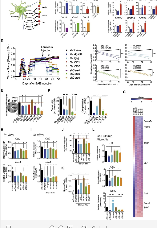 研究人员利用非肥胖糖尿病 (NOD) 小鼠建立了 EAE 模型,通过相关基因表达和敲除分析,确定了星形胶质细胞中的乳糖神经酰胺 (LacCer) 生物合成途径促进 NOD EAE 的发展,证明了鞘脂代谢驱使星形胶质细胞活动,促进 CNS 炎症及神经退化。