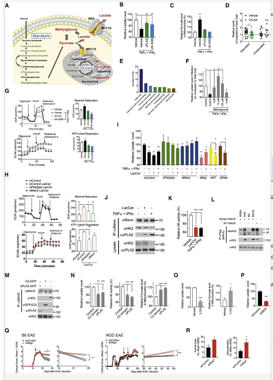 研究人员分析了 LacCer-cPLA2 信号对星形细胞代谢的影响及 MAVS 在其中的作用发现,促炎刺激通过 cPLA2-MAVS 诱导 LacCer 驱动的星状细胞代谢变化,增加了丙酮酸的线粒体氧化,从而降低乳酸的产生和释放。对炎症驱动的 cPLA2-MAVS 信号对 MAVS 与 HK2 相互作用的影响研究发现,cPLA2 C2 结构域可能取代 HK2 与 MAVS CARD 结构域相互作用,cPLA2 的过表达破坏了 HK2-MAVS 相互作用,导致 HK 活性降低,乳酸分泌减少,同时线粒体丙酮酸水平升高。通过乳酸运输胞外相关转运蛋白基因的敲除,揭示了星形胶质细胞中 cPLA2-MAVS 引起的乳酸释放减少可能与中枢神经系统病理有关。综上所述,在中枢神经系统炎症过程中,LacCer 驱动的cPLA2-MAVS 信号调控星形细胞的代谢及其支持神经元的能力。