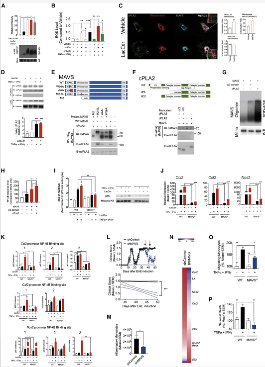 通过相关基因的突变与过表达,CoIP 与 Western blot 等方法检测发现,LacCer 诱导 cPLA2 进入线粒体并与 MAVS 共定位, cPLA2 的 C2 结构域和 MAVS 的 CARD 结构域介导 cPLA2-MAVS 相互作用,激活 MAVS。已知 MAVS 信号可以促进 NF-κB 的激活, 星形胶质细胞 MAVS 的缺失抑制了 LacCer 诱导的 NF-κB 核易位及其靶基因的招募,以及 Nos2, Ccl2 和 Csf2 的表达。敲除 Mavs 抑制了 NOD EAE 进展并减少 CNS 中促炎单核细胞的积累,以及星形细胞的致病活动相关 NF-κB 驱动的促炎症基因的表达。健康对照和 MS 脑样本免疫荧光数据分析进一步证明,鞘磷脂代谢通过 cPLA2-MAVS 信号轴激活 NF-κB,促进星形胶质细胞在 EAE 和 MS 中的致病活动。