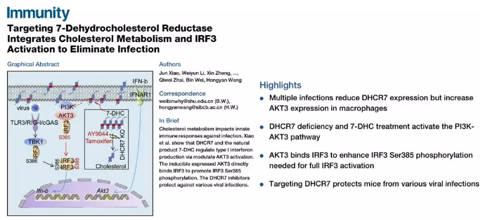 近日,免疫领域顶级期刊《IMMUNITY》在线发表了中国科学院生物化学与细胞生物学研究所研究员王红艳团队与上海大学教授魏滨实验室合作的题为 “Targeting 7-Dehydrocholesterol Reductase Integrates Cholesterol Metabolism and IRF3 Activation to Eliminate Infection” 的研究成果,该研究发现了抗病毒感染新型药物靶点 。快跟小编一起来拜读大牛新作吧~