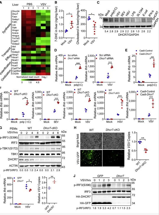 胆固醇代谢影响先天免疫应答,以抗感染。7- 脱氢胆固醇还原 (DHCR7) 是一种催化 7- 脱氢胆固醇 (7-DHC) 转化为胆固醇的酶,是胆固醇生物合成的最后一步。那么研究人员是如何发现 DHCR7 在抗病毒中的重要作用,并且进行验证的呢?