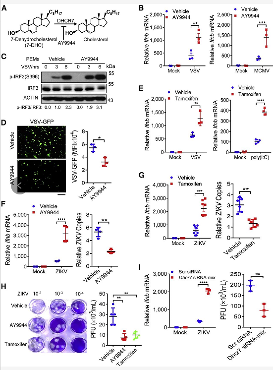 DHCR7 酶活对调节 INF-β 至关重要,研究人员利用 DHCR7 抑制剂处理巨噬细胞发现,在水疱性口炎病毒 (VSV)、寨卡病毒 (ZIKV) 中 Ifnb 的表达量升高;通过抑制 DHCR7 可以预防巨噬细胞受 VSV、ZIKV 感染。