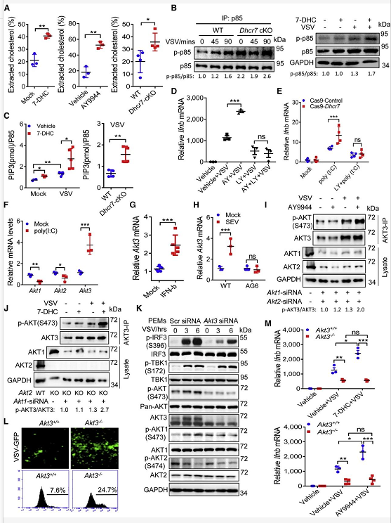 7-DHC 的积累、抑制剂 AY9944 处理或缺失 DHCR7 都破坏了细胞膜稳定性,上调 p85 的磷酸化,增强 PI3K 活性。抑制 PI3K 则阻断 Ifnb 的表达增强。从 PI3K 的下游入手,发现 AKT3 是 7-DHC 积累的关键下游效应器,导致感染后 IFN-β 升高。