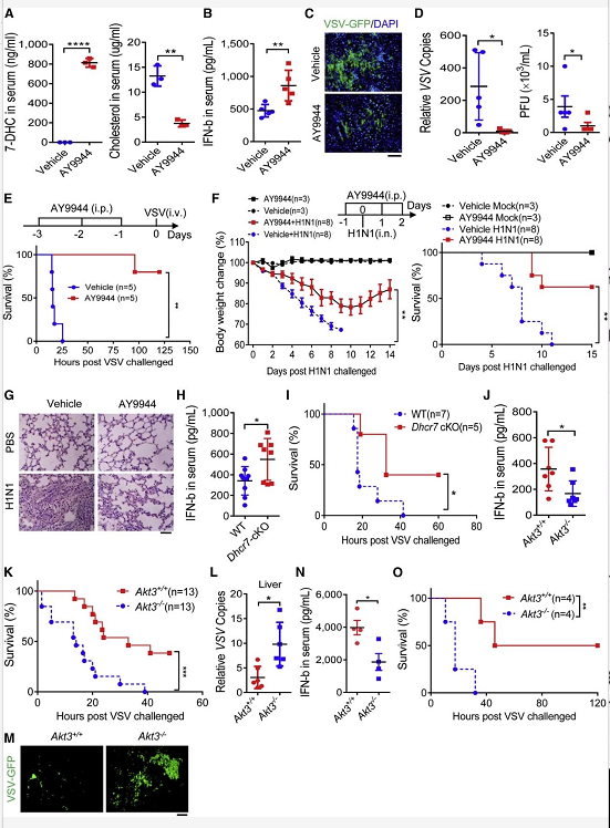 最后,研究人员用小鼠进行体内验证了,DHCR7 抑制剂 AY9944 保护小鼠免受病毒感染,降低小鼠死亡率,证明了靶向 DHCR7 能有效预防病毒感染。
