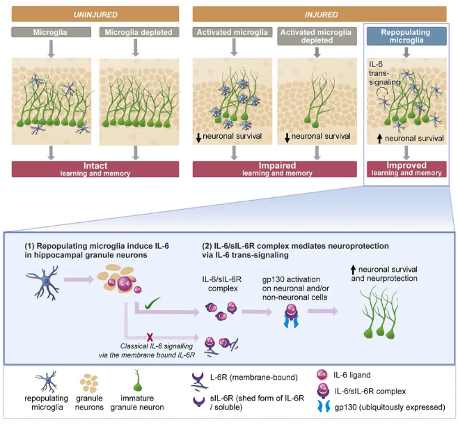 研究人员发现从小鼠脑部清除小胶质细胞对 TBI 没有显著影响,但是通过药理或遗传方法诱导这些细胞再生则可产生神经保护性小胶质细胞表型,且利于创伤后恢复。这些再生小胶质细胞的有益作用很大程度依赖于 IL-6 反式信号,能增强成人神经发生,特别是通过提高新生神经元的存活率来直接支持认知功能。作者认为,可以通过控制哺乳动物大脑中小胶质细胞获得神经保护性和前再生表型,以修复和缓解因脑损伤引起的认知缺陷。