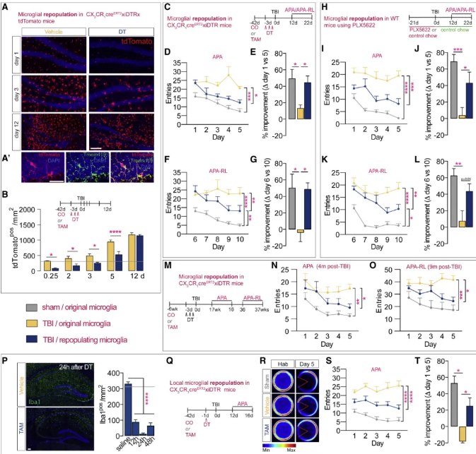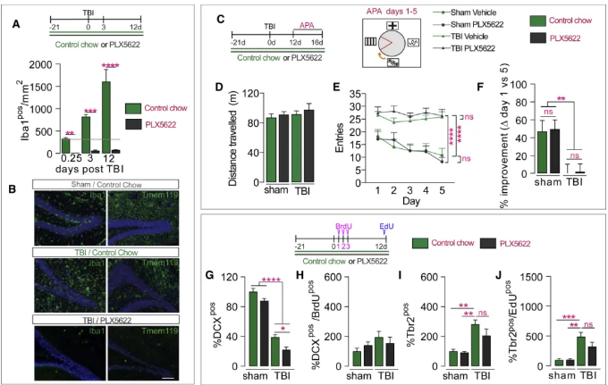 在 CX3CR1CreER 小鼠中,通过白喉毒素 (Diphtheria toxin, DT) 处理选择性消融小胶质细胞和小胶质细胞再生实验,发现 TBI 小鼠在术后星形胶质细胞出现再生,形态不同于原始小胶质细胞,且小胶质细胞的再生不影响星形胶质细胞数量。值得注意的是,在活跃地点回避 (APA) 测试中,遗传学和药理学方法导致的小胶质细胞的再生都能显著地缓解了受伤 12 天后 TBI 急性期小鼠认知缺陷,而对 TBI 的慢性期无效。