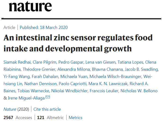 Nature 在线丨肠道锌传感器调节食物摄入量和生长发育