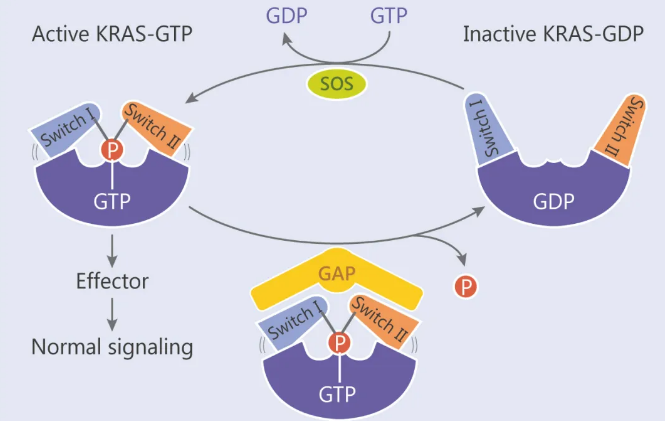 KRAS 蛋白通过结合 GTP 和鸟苷二磷酸 (GDP),在活性和非活性形式之间切换。此过程受到鸟嘌呤核苷酸交换因子 (GEFs, 如 SOS) 和 GTPase 活化蛋白 (GAPs) 的调控,GEFs 通过刺激 GDP 交换为 GTP,KRAS 处于激活状态; GTPase 活化蛋白 (GAPs) 通过刺激 GTP 水解而终止活性状态。在 KARS 激活状态下,会涉及两个区域的构象变化 (Switch I 和 II),这种构象变化使 KRAS 与下游效应子相互作用,并导致一系列下游信号传递事件。