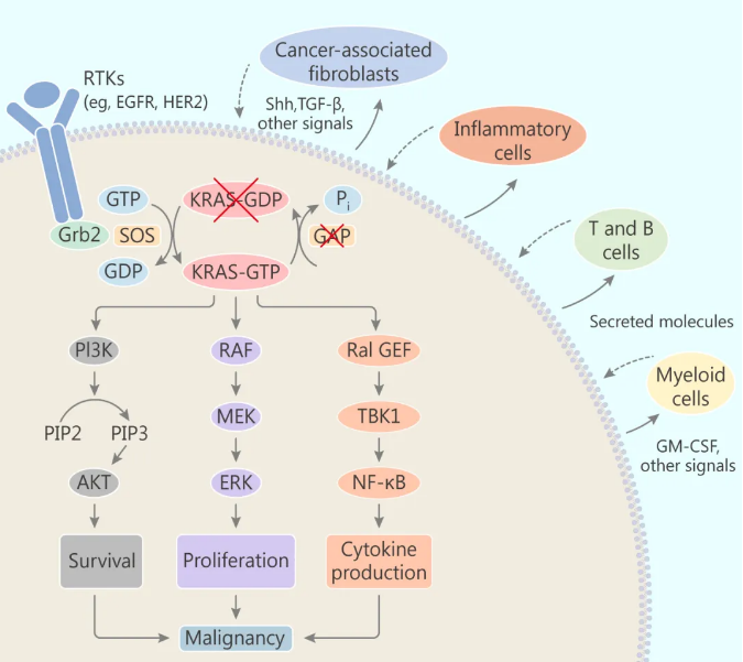 而突变的 KRAS 会通过破坏 GAP 活性,将 KRAS 锁定在活跃状态,并与下游效应子结合,最终促成肿瘤发生。该发生过程可能激活了多种信号传导途径,如 PI3K,RAF-MEK-ERK (MAPK),RAL-GEF 等。另外,致癌性 KRAS 还以旁分泌方式诱导影响基质周围的细胞 (如成纤维细胞,先天性和适应性免疫细胞),这些基质细胞反过来又促进了癌症的恶性。
