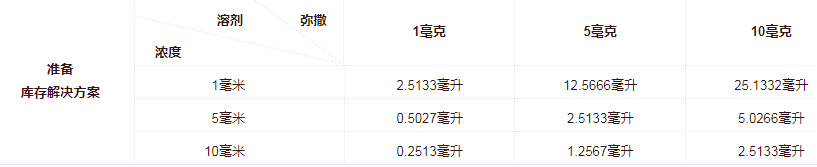 请根据产品在不同溶剂中的溶解度选择合适的溶剂替代储备液;一旦配成溶液,请分装保存,避免反复冻融造成的产品失效。