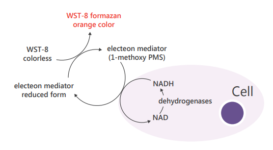 Cell Counting Kit-8,简称 CCK-8 试剂盒,是一种基于 WST-8 而广泛应用于细胞增殖和细胞毒性的快速、高灵敏度、无放射性的比色检测试剂盒。 CCK-8 溶液可以直接加入到细胞样品中,不需要预配各种成分。WST-8 在电子耦合试剂存在的情况下,可以被线粒体内的一些脱氢酶还原生成橙黄色的 formazan。