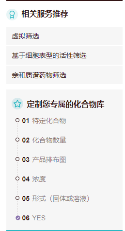 我们将在明确您的产品用途后,向符合资质的客户通过定制合成服务的方式提供 MCE 糖代谢化合物库,我们为该库中的所有产品提供溶液包装或粉末包装。溶液包装中,999 个产品以 10 mM 浓度提供,23 个产品以 2 mM 浓度提供,5 个产品以 3 mg/mL 浓度提供。