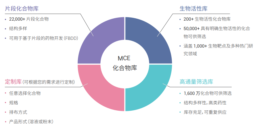 MCE 可提供 50,000+ 生物活性化合物, 1,600 万种实体化合物及 22,000+ 片段化合物,生物活性化合物包括小分子抑制剂/激动剂、ADC、PROTAC、生化试剂等,其中数百种化合物为 MCE 独家产品。产品持续上线,并即时更新至化合物库中,使化合物库拥有更强的筛选能力。