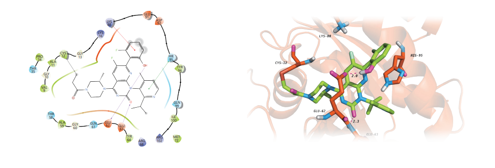 Sotorasib 与 KRAS G12C 的分子对接模式图: Sotorasib 的丙烯酰胺双键与 KRAS G12C 的 Cys12 发生共价结合;苯环上的羟基作为氢键供体与 Glu62 形成氢键作用,距离为 2.0 Å;嘧啶环上的羰基作为氢键受体与 Glu63 形成氢键作用,距离为 2.3 Å;此外,化合物不仅与 His95 形成 π-π 相互作用,2-氟-6-羟基苯基还可以与 Lys88 形成阳离子 -π 相互作用