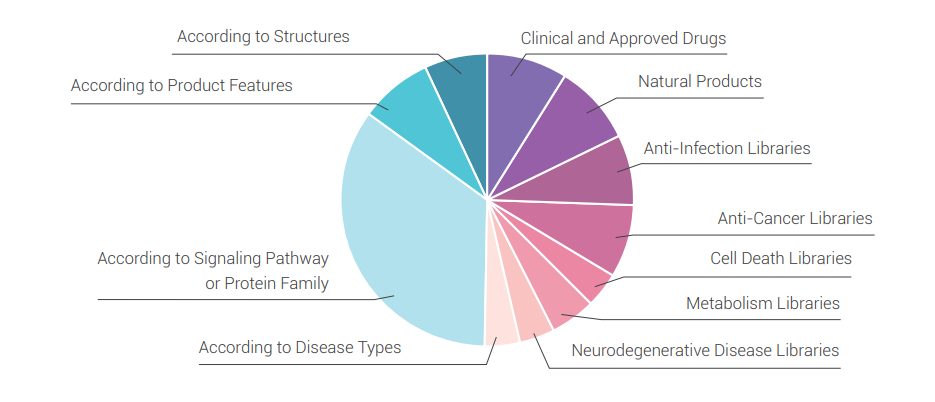 MCE 根据活性化合物所涉及的信号通路、研究领域、临床信息及其他特性,对生物活性化合物进行了详细分类,目前可以提供 200+ 种生物活性化合物库,涉及老药新用、天然产物、炎症、癌症、细胞死亡、代谢、神经退行性疾病等相关化合物库,更有根据产品性质及结构分类的多种化合物库。