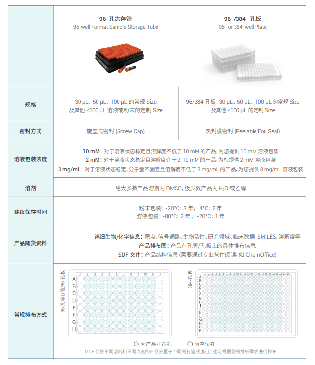 MCE 还提供化合物库定制化服务,您可以根据实验需求选择不同的化合物种类、规格、包装以及化合物排布