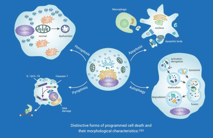 细胞死亡包括细胞程序性死亡和细胞坏死。细胞程序性死亡 (Programmed Cell Death, PCD),是指细胞接受某种信号调控或受到某些因素刺激后,为了维持内环境稳定而发生的一种主动性死亡过程,是一种正常的生理现象。目前发现了多种细胞程序性死亡形式,最常见的为凋亡、自噬、细胞焦亡、铁死亡和坏死性凋亡等。不同程序性死亡受不同调控机制的精密调控,在机体中发挥着不同的作用。细胞程序性死亡对维持机体稳态具有重要意义,程序性死亡调控失调与癌症、免疫性疾病、神经退行性疾病、心血管疾病等多种人类疾病的发生发展具有密切的关系。