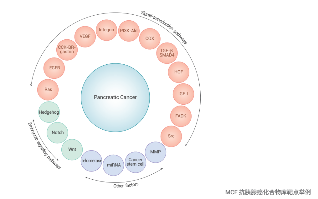 通过对目前用于胰腺癌治疗的临床阶段及批准上市药物的靶点进行分析,汇总得到了胰腺癌治疗中的常用靶点,基于这些常用靶点,MCE 抗胰腺癌化合物库集合了 2,600+ 化合物,这些化合物对胰腺癌均具有潜在的活性,是开发抗胰腺癌活性药物的有力工具,可用于高通量筛选和高内涵筛选