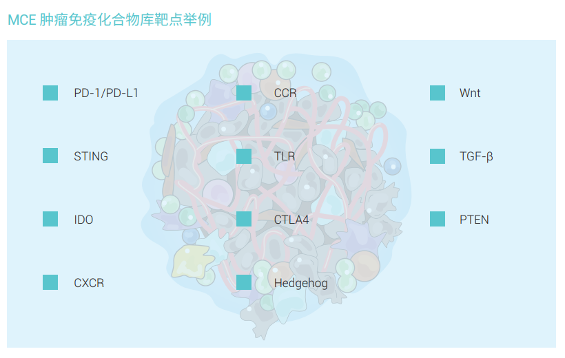 400+ 肿瘤免疫相关小分子化合物的集合,均靶向肿瘤免疫相关靶点,如 PD-1/PD-L1、CXCR、STING、IDO、TLR 等重要的免疫检查点