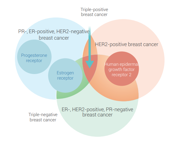 乳腺癌是一种异质性疾病,根据乳腺癌细胞三种分子标记物雌激素受体 ER、孕激素受体 PR 及人表皮生长因子2(HER2)表达情况,主要分为三种亚型:HR+/HER- 乳腺癌(——70%),HR+/HER+ 乳腺癌(——15%-20%)、三阴性乳腺癌(——15%)。