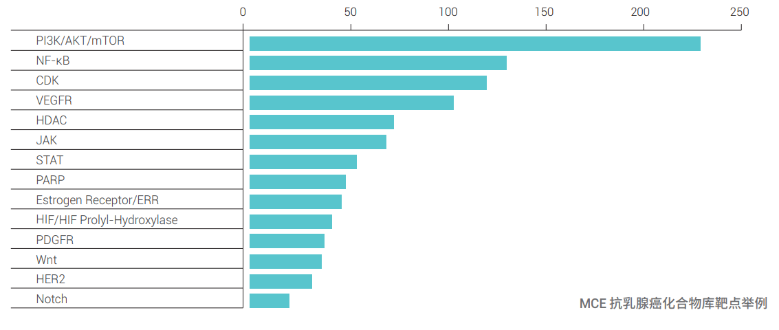 HER2、Estrogen Receptor、CDK、VEGFR、PI3K 等是乳腺癌治疗中常用的靶点,是开发新型乳腺癌靶向治疗药物的重要靶标