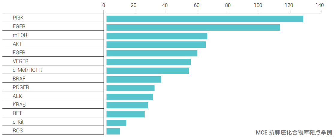 通过对目前用于肺癌治疗的临床阶段及批准上市药物的靶点进行分析,汇总得到了肺癌治疗中的常用靶点,基于这些常用靶点,MCE 抗肺癌化合物库集合了 1,800+ 化合物,这些化合物对肺癌均具有潜在的活性,是开发抗肺癌活性药物的有力工具,可用于高通量筛选和高内涵筛选