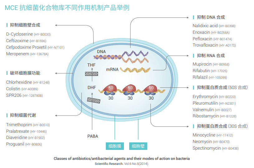 化合物活性丰富,靶向多种细菌靶点,如细菌细胞壁合成、蛋白质合成、DNA 复制和代谢等,可以避免因某种耐药机制导致的筛选效率低的问题,可用于新适应症的研究及新型抗菌药物的开发