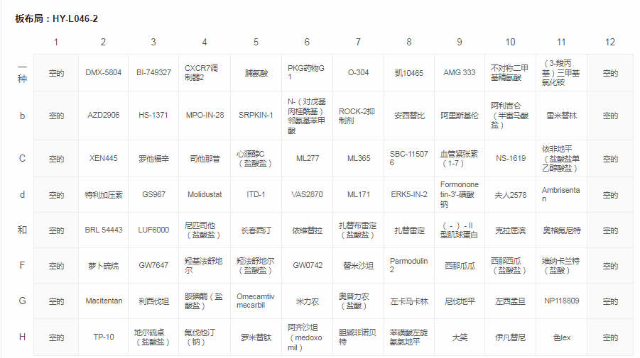 公式:以预溶解的DMSO溶液或固体形式提供的482种抗心血管化合物的集合