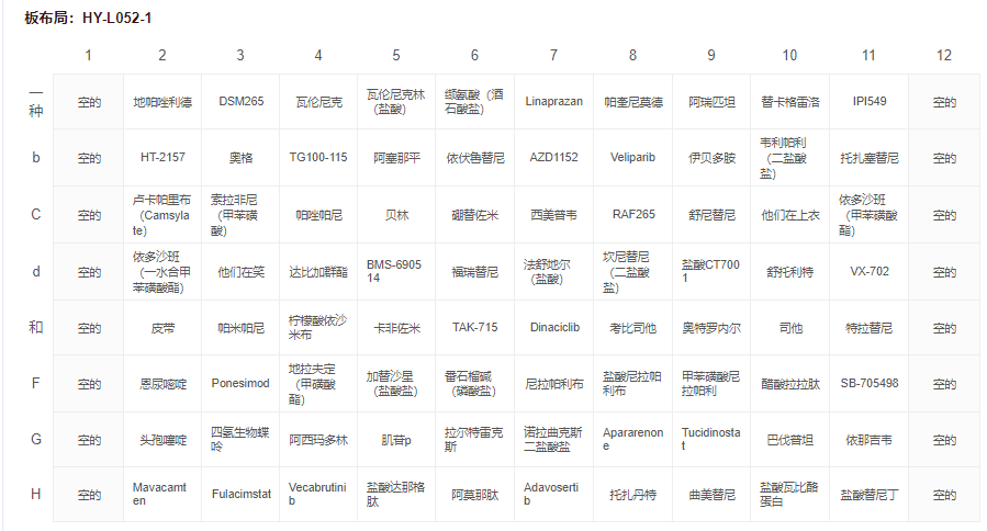 组成:以预溶解的DMSO溶液或固体形式提供的504种可能具有抗COVID-19活性的化合物的集合