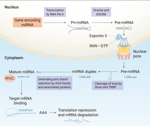 miRNA基因由RNA聚合酶Ⅱ 转录,生成较长的前体 pri-miRNA,然后与辅助因子 DGCR8 一起被核糖核酸酶 Drosha 切割,从而产生一个发夹状的 pre-miRNA。随后,在 Exportin 5-RNA?GTP 复合体介导下,pre-miRNA 从细胞核转移至细胞质中,并在细胞质中被核酸酶 Dicer 切割掉末端的茎环结构,形成一个成熟的 miRNA 双链。成熟的 miRNA 被装载到Argonaute(AGO) 蛋白上,结合形成 miRNA-诱导沉默复合物 (miRNA-inducing silencing complex,miRISC),AGO 蛋白会对 miRNA 两条链进行选择,5’端热稳定性较低的 miRNA 引导链 (miRNA guide strand) 优先被保留,另一条乘客链 (miRNA pass) 则被降解。