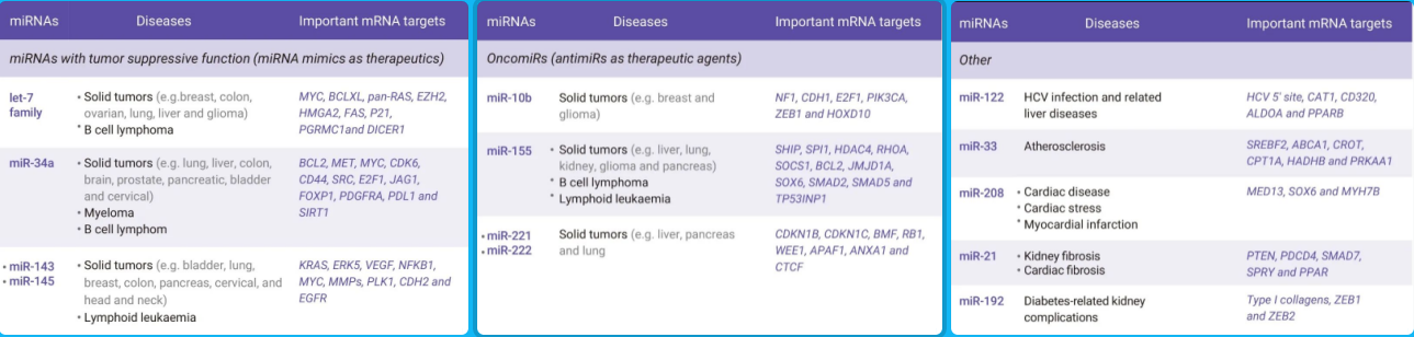 据估计, miRNA 参与了多种关键的生物和细胞过程,如凋亡、分化、发育,增殖、代谢及信号转导通路等,调控人类基因组中多达 30% 的蛋白质编码基因。此外,miRNA 失调常与癌症、糖尿病以及心血管疾病等多种人类疾病相关。随着对 miRNA 的深入研究,人们发现 miRNA 能够以 miRNA 模拟物 (miRNA mimics)、 miRNA 抑制剂 (antimiRs) 或其他形式来靶向在疾病状态下发生改变的多个 mRNA,用于多种疾病治疗 (图 2)。