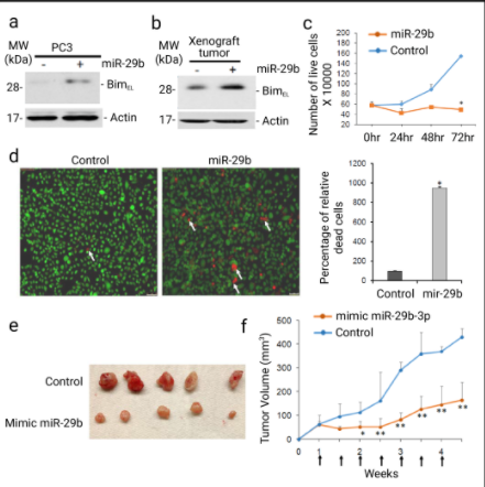 a-b:用 Bim 特异性抗体 Western blot 分析 (a) PC3 细胞的细胞裂解液和 (b) 用 mimic miR-29b 处理的异种移植瘤;c:PC3 细胞转染对照或模拟 miR-29b, 在 0、24、48、72 h, 用台盼蓝染色细胞,用血细胞计计数活细胞数量。数据以三个独立实验的平均值±标准差表示;d: 用 Calcein AM (绿色为活细胞)和 Ethidium homodimer-1 (红色为死细胞) 染色对照或转染miR-29b 的 PC3 细胞, 通过荧光显微镜定量活细胞和死细胞。箭头表示死亡细胞。右图显示死亡细胞的定量,由五个随机区域计算; e: 对照和实验小鼠的代表性肿瘤; f: 每周监测 2 次肿瘤体积,以平均值表示。
