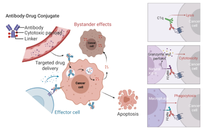 ADC 的抗体成分与免疫效应细胞相互作用,诱导抗肿瘤免疫(右图自上至下依次为 CDC、ADCC 和 ADCP 效应)。