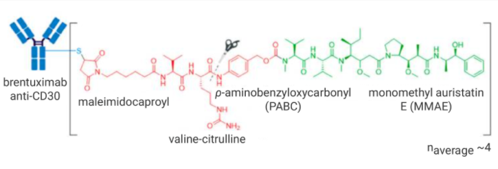 Brentuximab vedotin 由抗 CD30 抗体和 毒素分子 MMAE 组成,可用于复发难治性霍奇金淋巴瘤的研究。