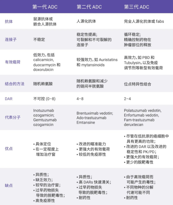 ADC 药物抗体的选择是多元的,但连接子、毒素种类、偶联方式是有限的, 三者之间不同的搭配选择,均会影响到 ADC 药物的临床效果。ADC 药物的结构设计是其成功的核心,纵观已上市的 ADC 药物,可以根据药物选择和技术特点分为三代。