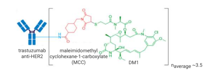 Trastuzumab emtansine 结合了 HER2 靶向的曲妥珠单抗的抗肿瘤特性以及微管抑制剂 DM1 的细胞毒活性,可用于晚期乳腺癌的研究。