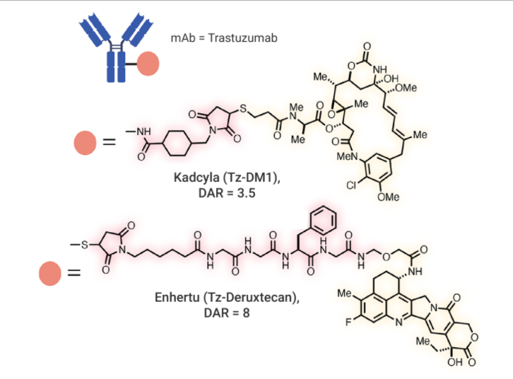 三代 ADC 通过全方位的研发和改进解决了前两代药物的不足,代表产品为 Padcev? 、Enhertu? (fam-trastuzumab deruxtecan-nxki) 。例如同为 HER2 靶向的 ADC,与 Kadcyla 相比,Enhertu? 在抗体选择上抗体部分均为曲妥珠单抗,但在毒素分子、连接子及偶联方式等方面多有所不同。Kadcyla? 由曲妥珠单抗和微管抑制剂 DM1 经硫醚键连接而成,DAR 值约为 3.5,;Enhertu? (ado-trastuzumab emtansine) 的小分子 DXd 是一种 DNA 拓扑异构酶 I 抑制剂,DAR 值约为 8。此外 Enhertu 采用了一种四肽连接子,可被细胞中的蛋白酶剪切;Enhertu 具有旁杀效应 而 Kadcyla 没有。