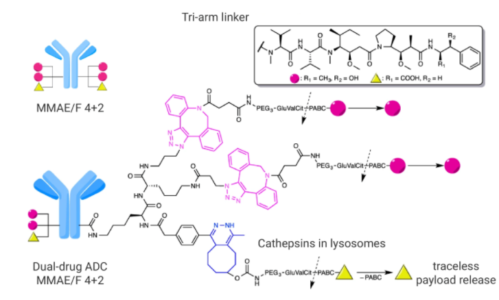 还可以开发采用两种不同细胞毒性剂作为有效载荷的双有效载荷 ADC 来降低耐药性,例如下图,设计了一种同时含有 MMAE 和 MMAF 的均质抗 HER2 ADC,并在异种移植小鼠模型中发挥了比相应的单一有效载荷 ADC 的共同给药更显着的抗肿瘤活性。