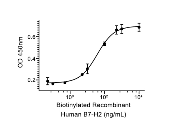 2、通过功能性ELISA测定其结合能力。当Recombinant Mouse ICOS以浓度为1 μg/mL(每孔100 μL)的形式固定时,能够与Biotinylated Recombinant Human rhB7-H2发生结合。这种效应的ED50为37.18 ng/mL。