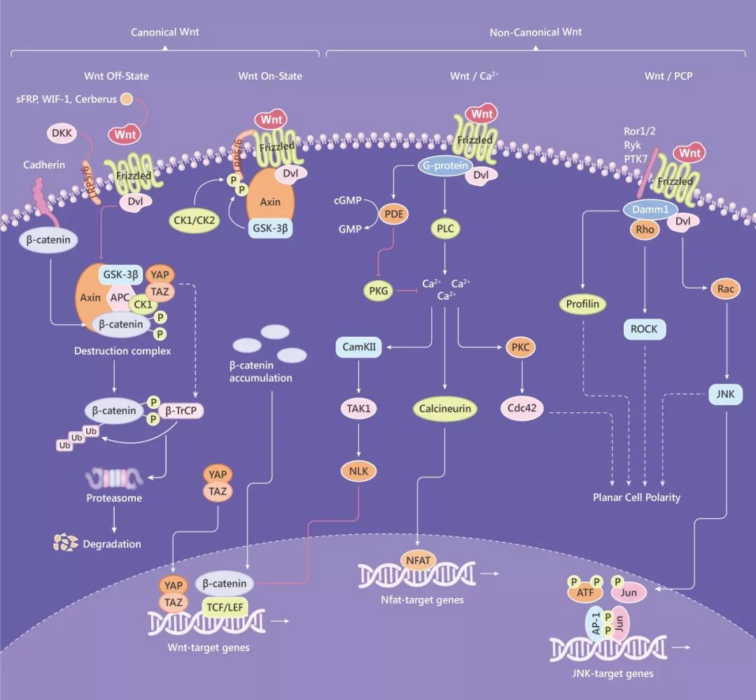 Wnt 信号通路是一种古老的、进化上保守的通路。其中,Wnt 蛋白属于分泌的糖蛋白,可与卷曲蛋白 (Frizzled) 家族的受体,如与脂蛋白受体相关的蛋白 5/6 (LRP5/6),Ror2 和 Ryk 相互作用,导致各种细胞内信号传导级联激活,这些信号传导级联可以交叉连接或独立发挥作用,调节多种多样的过程,包括细胞增殖,分化,迁移,极性和不对称细胞分裂以及与干细胞更新有关。因此,Wnt 途径的突变往往与人类出生缺陷、癌症以及其他疾病有关。