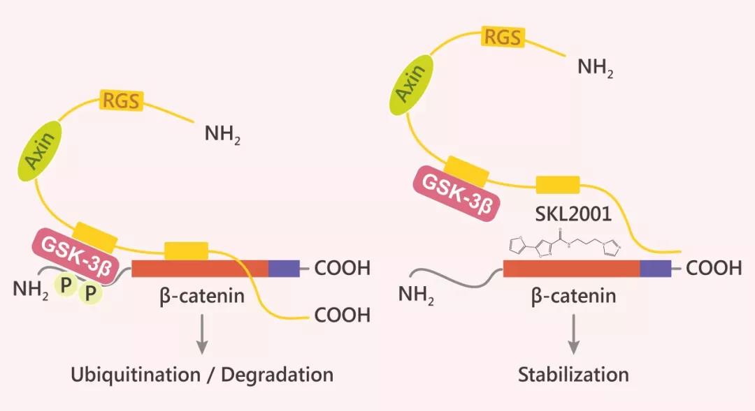 SKL2001 是一种通过增加 β-catenin 的稳定性来激活 Wnt 信号传导的特异的 Wnt/β-catenin 激动剂。SKL2001 与 Axin 竞争性地与 β-catenin 的结合,破坏 Axin/β-catenin 的相互作用,从而破坏 CK1 和 GSK-3β 介导的 Ser33/37/ Thr41 和 Ser45 处 β-catenin 的磷酸化,进而增加 β-catenin 的稳定性,确保其不被蛋白酶体降解。CK1 和 GSK-3β 酶活性不受 SKL2001 影响 (如下图)。