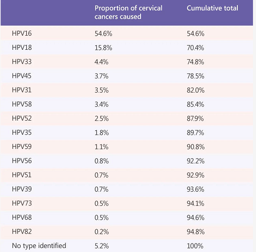 类型: 100 多种,至少 14 种是致癌的,两种 HPV 类型 16 和 18 引起 70% 的宫颈癌和癌前宫颈病变,大约 90% 的生殖器疣是由 6 和 11 型 HPV 引起的