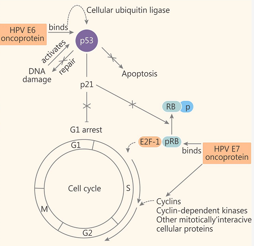(E6 和 E7 编码的多功能蛋白与 p53 和 pRB 结合,破坏细胞周期的调节)