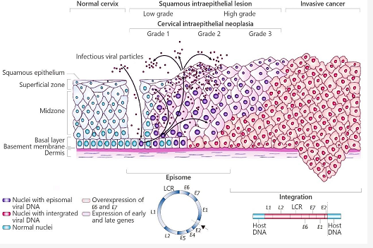 首先,HPV 被认为是通过宫颈上皮细胞的微擦伤进入并感染基底细胞。感染后,早期 HPV E1、E2、E4、E5、E6、E7 基因表达,病毒 DNA 从衣壳释放并作为游离 DNA 进入细胞核进行复制和扩增。在上皮的上层 (Midzone, Superficial zone),病毒基因组进一步复制,晚期基因 L1、 L2 和 E4 被表达,L1 和 L2 包住病毒基因组,在细胞核内形成子代病毒粒子。脱落的病毒可以引发新的感染,低级上皮内病变支持生产性病毒复制,未知数量的高危型病毒引起高级宫颈上皮内瘤样病变,未处理的病变进展为微侵袭和侵袭性癌症与 HPV 基因组整合到宿主染色体有关,伴随着 E2 的丢失或中断和随后的 E6 和 E7 癌基因表达上调[4]。