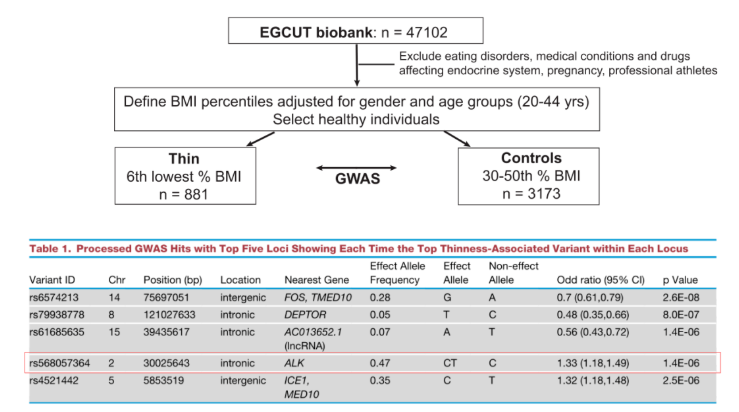 首先,研究人员对 Estonian 生物库中的新陈代谢健康的人群 (20-44 岁) 进行了全基因组关联分析 (Genome-Wide Association Study, GWAS),通过 BMI 指数分组,对比瘦子和正常体重控制组数据,找到了一些和瘦相关的基因位点,意外的发现其中一个变异位于 Alk 基因的第一个内含子上。