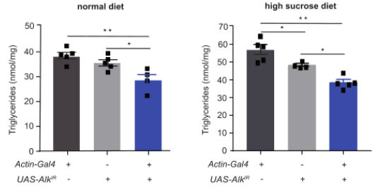 然后利用果蝇对候选基因进行优选排序,用 RNAi 介导的敲降对 5 个候选位点附近的 ~1Mb 内的 38 个基因敲降,并评估对果蝇全身甘油三酯水平的影响。多次重复试验证实了正常和高糖饮食中,Alk 的敲降会导致甘油三酯水平的降低。