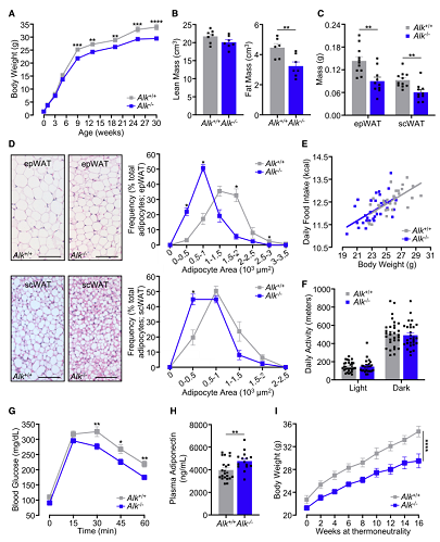 最后,研究人员在小鼠中进行验证。Alk 敲除小鼠在运动、协调和平衡、痛觉、外表、生育能力、组织形态、血液成分、血清化学上对比控制组没有显著差异,Alk 缺陷小鼠的皮下脂质积累减少,以同样条件喂养数周,Alk 缺陷小鼠表现出体瘦的表型,且脂联素水平升高,葡萄糖稳态改善,但食物摄入量和活动量没有变化。不仅如此,Alk 缺陷小鼠还表现出对饮食和瘦素突变诱导的肥胖的抵抗性。