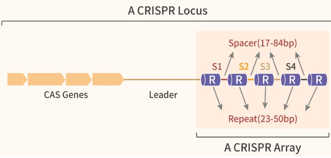 CRISPR 主体为 CRISPR 基因座 (CRISPR Array): 由多个重复序列 (Repeats)和间隔序列 (Spacers) 组成。