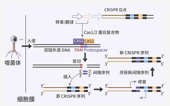 当噬菌体等外源 DNA 入侵时,CAS1/2 复合体通常识别 3' 端含 NGG 的前间隔序列邻近基序 (PAM) 区域。然后,前间隔序列 (Protospacer) 被剪切下来,作为间隔序列插入宿主 CRISPR 位点中,由重复序列隔开。PAM 序列结构简单,几乎可在所有基因中找到,因此得到广泛的应用。